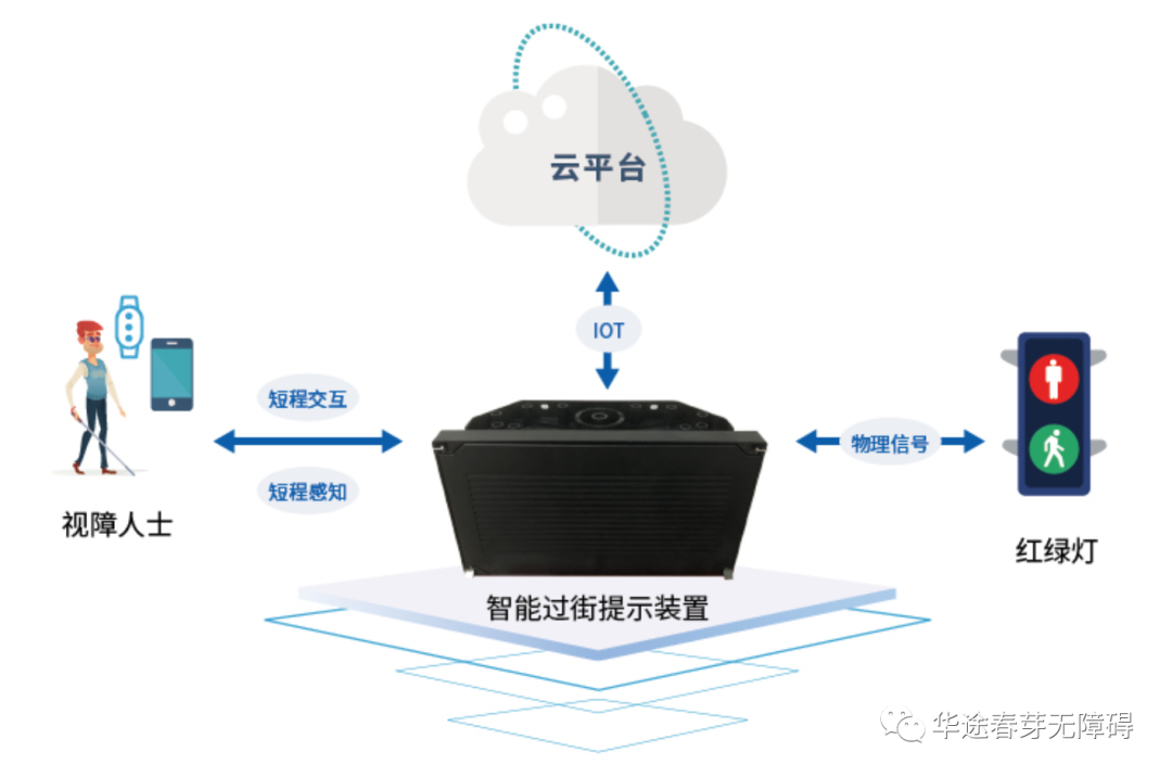 以过街声响提示装置为核心,通过物理信号与红绿灯连接,将红绿灯信息转化为声音信息和无线广播信息。系统日常处于静音状态,在感知到周边有需求者时自动播报提示音。视障人士可通过智能手机或智能穿戴设备(手环)即可与装置互联互通,获取过街无障碍服务。