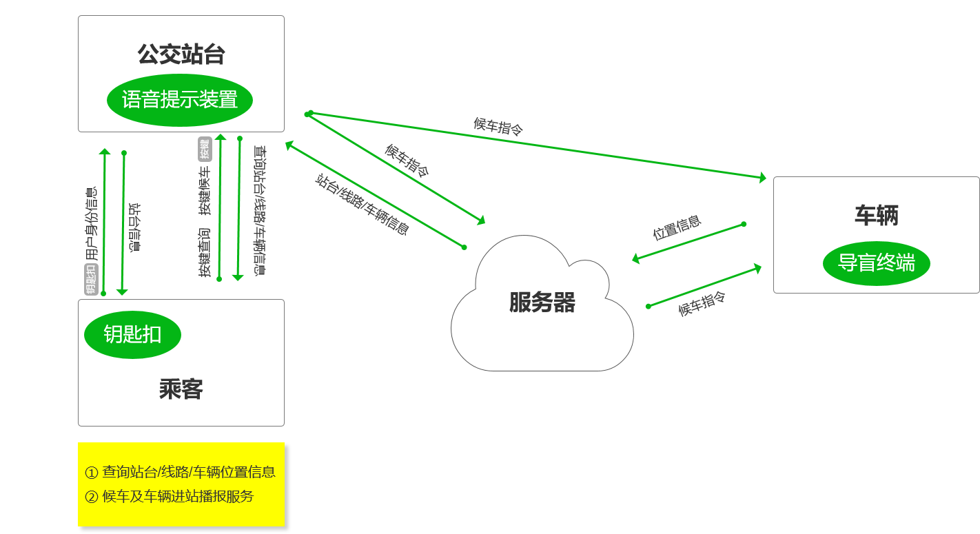 通过语音播报为用户提供杠查询公交站台,公交线路和公交车辆信息;一键预约无障碍公交车辆;通过可穿戴设备(如钥匙扣)实现无感预约无障碍公交车辆